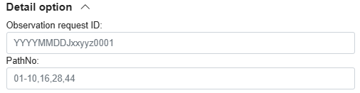 - Basically, the above parameters are sufficient for a search, and advanced options can be specified for more detailed searches. The observation request ID is an ID issued when you apply for a satellite observation, and is specified when you wish to search for data you have applied by yourself. The path number specifies the path the satellite will take during the observation.