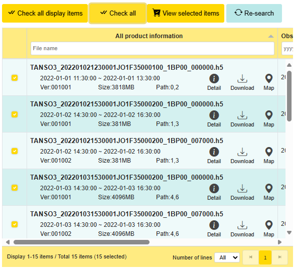 - The list of search results is displayed in this format. Each product has a detail icon, a download icon, and a map icon, which can be used to perform operations.