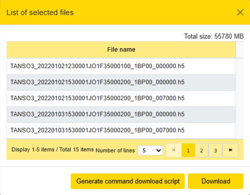 - Selecting a few products activates the View selected items button. View selected items will display the currently selected products. To download the selections from the user terminal at a later date, select the Generate Command download script button. If you want to download all selected files, select Download to start downloading. If the number of files or file size is large, it will take time to download.